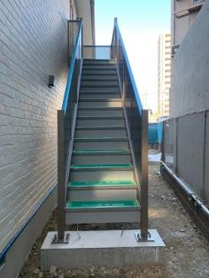 3階建て鉄骨階段、手摺りは丸棒仕上げ